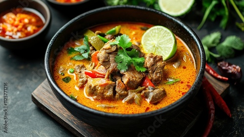 A fragrant soup brimming with tender meat and vegetables, enriched with spices and served with lime and sambal on the side. Artfully placed in a traditional bowl, exuding warmth.