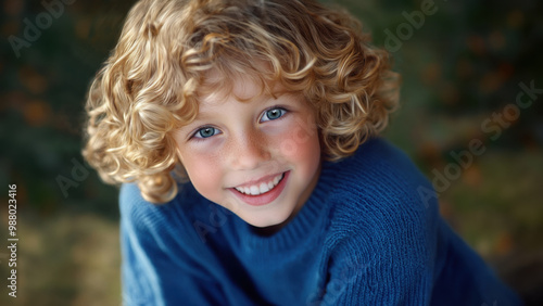 fresh, faced, young, girl, healthy, complexion, short, blond, hair, smiling, smile, sitting, outdoors, leaning, wearing, lightweight, blue, sweater, children, childhood, face, youth, preteen, person, happiness, joy, children, autumn