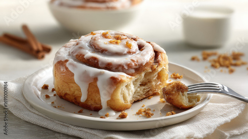 A freshly baked cinnamon roll topped with thick icing sits on a plate. The soft, fluffy pastry is swirled with cinnamon and sugar, making a perfect sweet treat.
