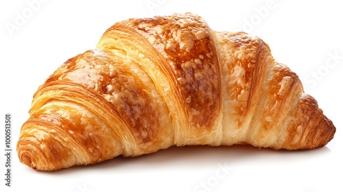 A freshly baked croissant with a golden brown crust, isolated on a white background.