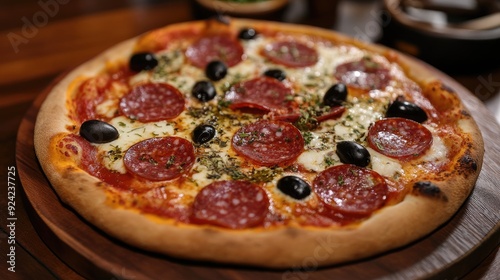 A freshly baked Italian pizza with spicy salami, mozzarella, and olives.
