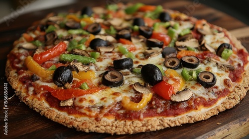 A freshly baked pizza rests on a wooden board, featuring a colorful assortment of bell peppers, black olives, mushrooms, and melted cheese against a rich tomato sauce