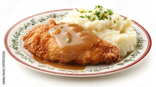 A fried chicken breast plated with mashed potatoes and gravy, isolated on a fine china plate
