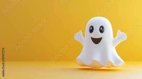 ghost, three-dimensional, halloween, october, holiday, festival, yellow background, isolated, white, design, graphic, illustration, cartoon, clip art, digital artwork, adorable, cheerful, friendly, whimsical, festive, fun, playful, skittish, creepy, trick or treat, harvest, autumn, fall, ghostly, phantom