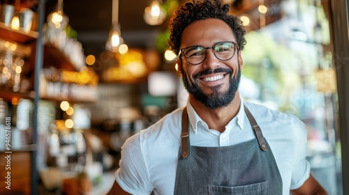 A friendly barista with a beard and glasses is smiling warmly inside a modern coffee shop, wearing an apron and standing amidst warm lighting and a cozy setting.