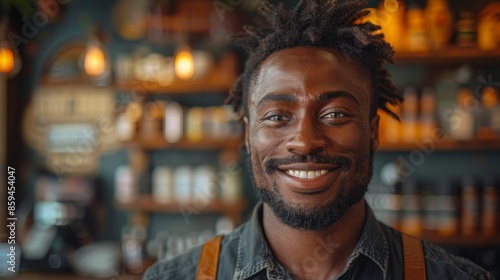 apron, nose ring, dreadlocks, cosy, cafes, smiling, inviting, shelf, smile, warmth, hospitality, product, shopkeeper, welcoming, customer service, vibrant, detailed, engaging, modern, realistic, cheerful, lifestyle, compelling, bright, appealing, service industry, professional, energetic, satisfying
