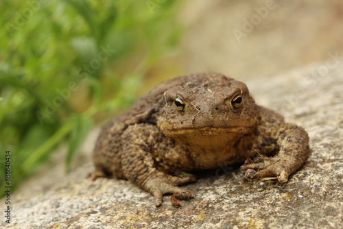 A frog looking into the lens. A big frog on a stone with green grass in the background.