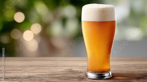 frosty, pint, gold, lager, weathered, wooden, bar, top, under, warm, ambient, pub, lighting, soft, bokeh, background, empty, space, right, overlay, text