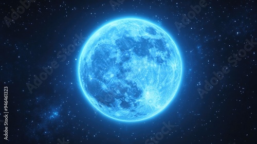 A full blue moon with a soft, glowing aura, surrounded by twinkling stars.
