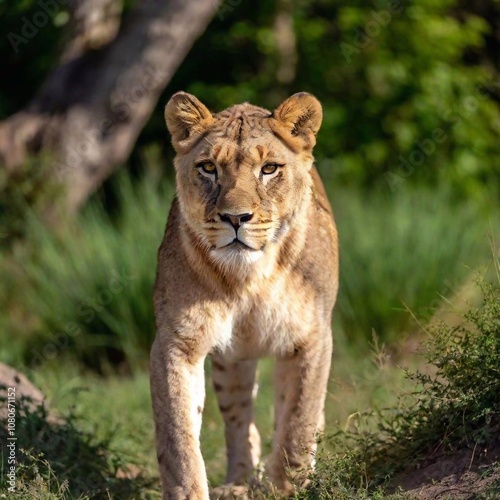 A full shot photo of a lioness in mid-roar, deep focus on its open mouth and intense facial expression, low-angle shot capturing the full body and the dynamic energy of its powerful stance