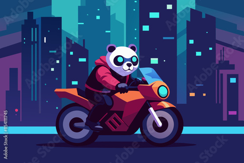 A full-length humanoid cyberpunk panda riding a bike blended with a white background