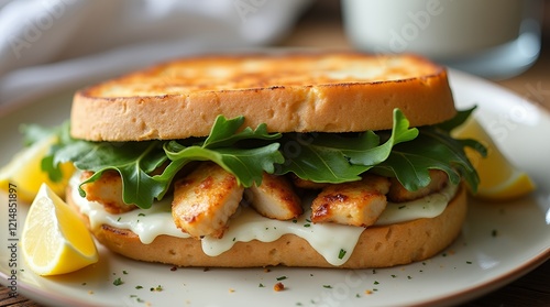 A fully framed panini with grilled chicken, mozzarella cheese, arugula, and yogurt sauce.
