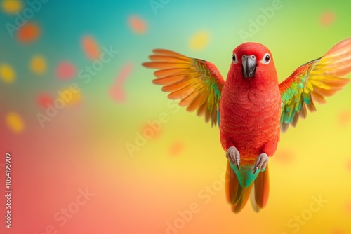 a funny parrot that raised one wing, as if waving, looking directly into the camera. Bright abstract background with shades of yellow, blue and orange, good lighting, emphasis on bright plumage