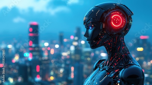 A futuristic android with a matte black surface, LED lights outlining its joints. Sharp contours, urban skyline. High-tech innovation, human-machine hybrid.