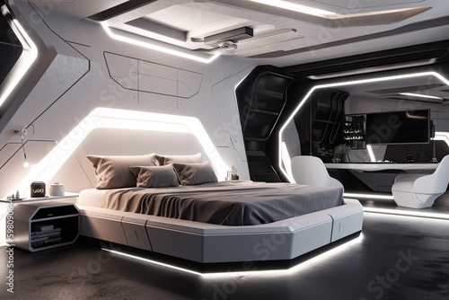 a futuristic bedroom with sleek lines and advanced technology to create a peaceful and tranquil space, created with generative ai