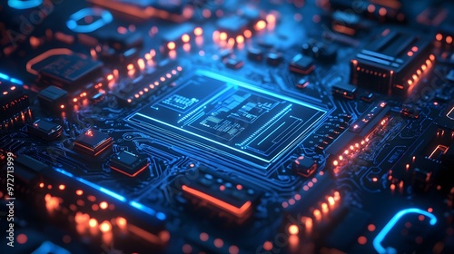 A futuristic circuit board glowing in neon blue, filled with intricate technology patterns and digital landscape elements, showcasing high-tech machinery in a cyberpunk aesthetic.