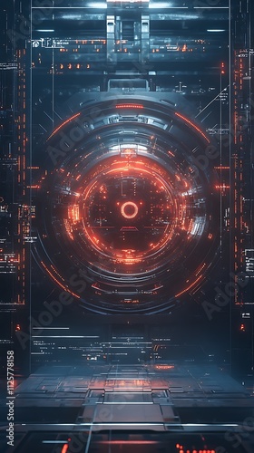 A futuristic circular interface with glowing elements, suggesting advanced technology.