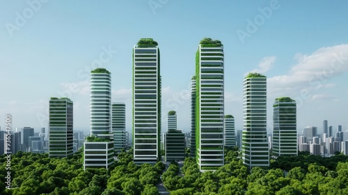A futuristic city center with green skyscrapers, smart technology, and a focus on sustainability, urban development, technological innovation, sustainability