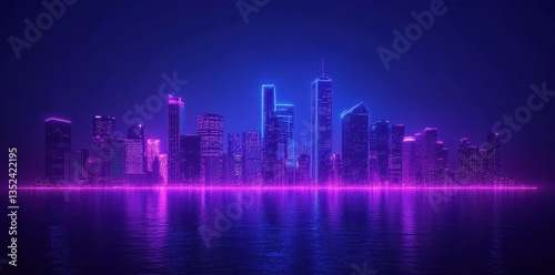 skyline, city, building, urban, architecture, futuristic, neon, light, water, night, dark, blue, purple, violet, digital, art, design, modern, abstract, scenic, illumination, bright, glow, aesthetic, ambient, city landscape, skyscraper, tower, horizon, waterfront, bay, dusk, twilight, scene, high-coloured, energy, highrise, technology, metropolis, illuminated, structure, pattern, visual, render, artificial, visualisation