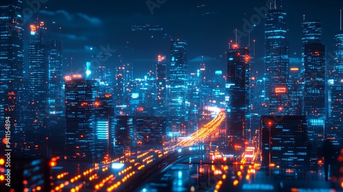 A futuristic cityscape at night with AI-controlled lights and traffic systems Stock Photo with copy space