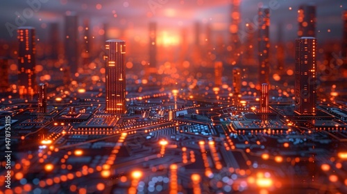 futuristic, city landscape, circuit, board, glowing, digital, technology, abstract, network, datum, cyber, electronic, system, communication, hardware, cyberspace, concept, design, innovation, artificial, intelligence, visualisation, processor, component, connection, infrastructure, information, architecture, computing, development