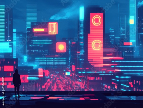 A futuristic cityscape showcasing vibrant neon lights and towering skyscrapers, evoking a sense of digital innovation.