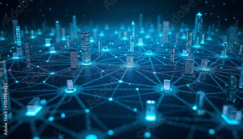 A Futuristic Cityscape with Glowing Skyscrapers and Interconnected Digital Infrastructure for Smart City Concepts
