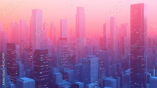 city, futuristic, city landscape, skyscraper, building, neon, light, glasses, window, architecture, urban, modern, night, pink, blue, purple, dusk, twilight, glow, illuminated, abstract, digital, art, graphic, design, illustration, render, three-dimensional, skyline, horizon, aerial, view, metropolis, dense, crowded, geometric, pattern, grid, line, texture, vibrant, colours, contrast, moody, atmosphere, mood, aesthetic