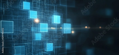 A futuristic digital background showcasing interconnected blue cubes and grid patterns, perfect for illustrating concepts in technology, data science, and innovation.