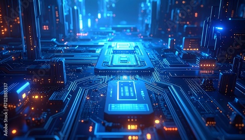 A futuristic, glowing circuit board design, bathed in blue and orange light, with digital structures