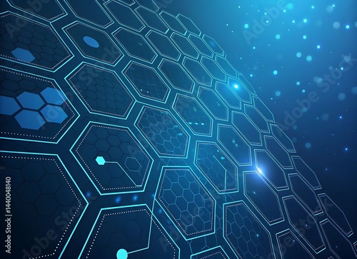 A futuristic hexagonal grid forming a technological network with a bokeh effect.