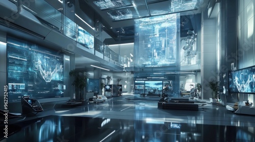 A futuristic, high-tech workspace featuring advanced displays and sleek design.