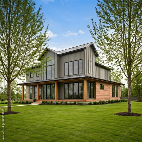 A futuristic home with large windows, a flat roof, and a landscaped lawn filled with vibrant flowers, trees, and a stone pathway leading to the door, Ai Generated