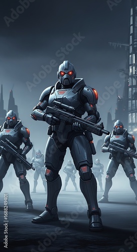 military, futuristic, armoring, soldier, weapon, formation, action, city, dark, grey, red, glowing, tactical, robot, science fiction, uniform, battle, army, defense, technology, equipped, prepared, standing, protection, stance, combat, ready, beautiful, colourful, bright, creative, modern, elegant, stylish, professional, decorative, vibrant, stunning, amazing, marvellously, fantastic, gorgeous, lovely, charming, attractive