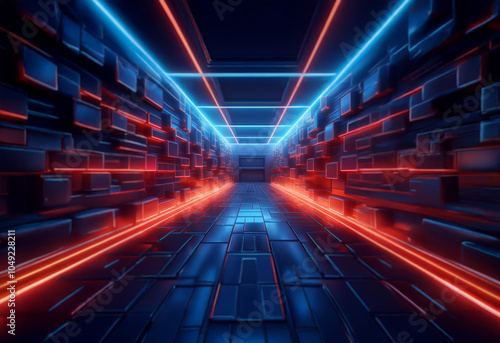 A futuristic, neon-lit corridor with red and blue lines, glowing against dark, geometric walls.