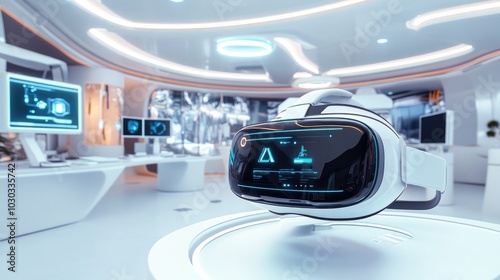 A futuristic office environment illustrating digitization, featuring virtual reality headsets, smart devices, and digital displays on a white background emphasizing modern technology.