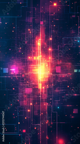 A futuristic pixelated digital background with glowing neon lights and abstract circuit-like patterns. The vibrant pink, blue, and orange tones evoke a high-tech cyberpunk feel.