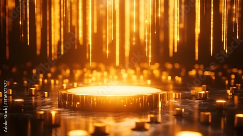 A futuristic podium glowing softly in an environment filled with floating golden candles