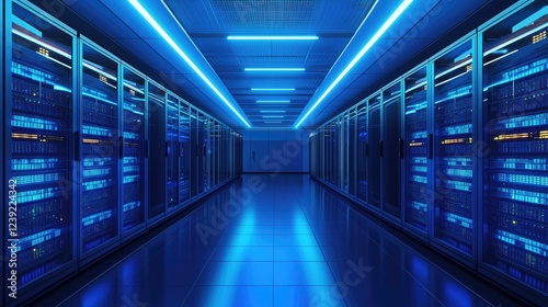 A futuristic server room illuminated with vibrant blue lights, showcasing sleek rows of high-tech server racks. Ideal for IT, cloud computing, and data center concepts