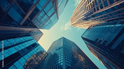 A futuristic skyline view looking up at office towers with sharp angles and blue-tinted windows against a bright sky.