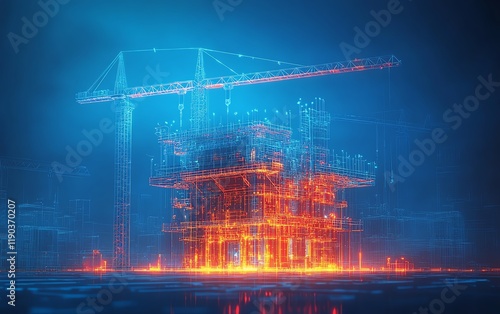 futuristic, skyscraper, construction, glow, holographic, blueprint, robotic, crane, craftsmanship, visual, innovation, machinery, metropolis, infrastructure, housing, development, exterior, resolution, environment, city landscape, future, artistry, panorama, grandeur, aestheticism, perspective, dynamic, detail, engineering, structural, industrial, realism, city, architecture, project, aesthetic, technology, progress