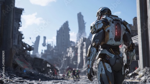 soldier, futuristic, city, ruin, city landscape, robot, warfare, battle, destruction, apocalypse, post, apocalyptic, damaged, broken, building, structure, debris, debris, concrete, steel, metal, armoring, suit, helmet, weapon, technology, advanced, combat, android, android, science fiction, science, fiction, military, army, war, future, urban, decay, grey, white, gold, sky, day, sun