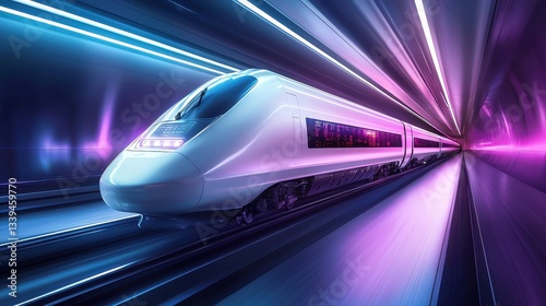 A futuristic train speeds through a vibrant, illuminated tunnel, showcasing advanced technology and dynamic design.