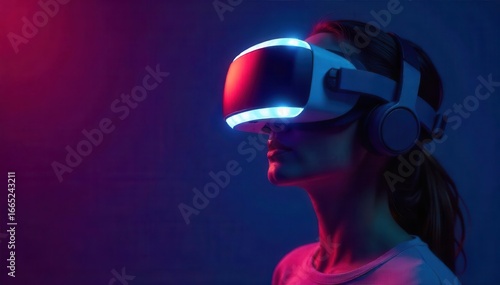 A futuristic virtual reality headset with glowing lights against a dark background , entertainment, digital