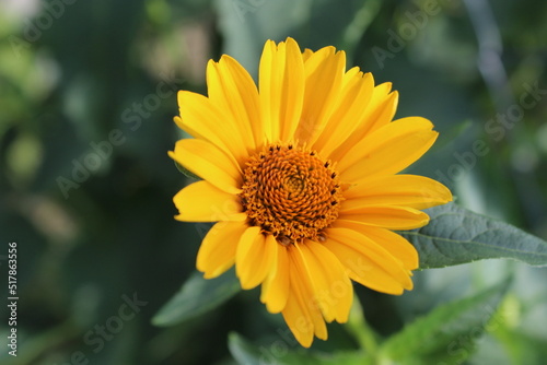 A garden yellow flower called Heliopsis, photographed close-up from above, with a blurred background.