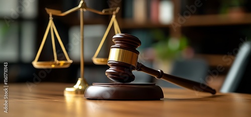 A gavel and scales of justice on a wooden table symbolize law and order.