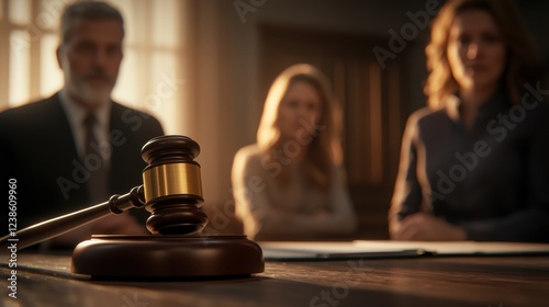 A gavel rests on a table with three individuals in the background, symbolizing a legal setting, courtroom proceedings, and the pursuit of justice.
