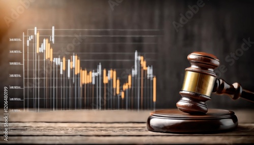 A gavel rests on a wooden surface with a fluctuating stock market graph in the background, symbolizing the intersection of law and finance.