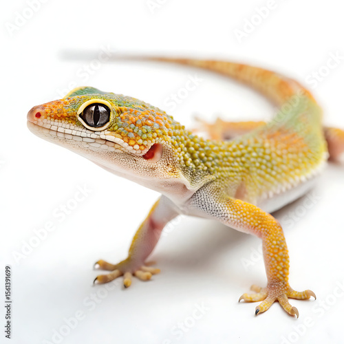 A gecko is posing in a straightforward manner, isolated on a white background.