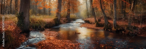 A gentle creek winds through a forest blanketed in red and orange autumn leaves, reflecting the seasonal change and natural beauty